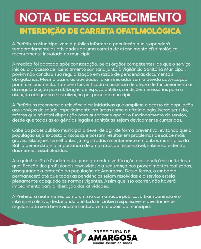 A Prefeitura de Amargosa anunciou a suspensão temporária das atividades de uma carreta de atendimento oftalmológico instalada recentemente no município. A medida foi adotada após a identificação de irregularidades no processo de funcionamento do serviço, segundo nota oficial divulgada pela administração municipal.